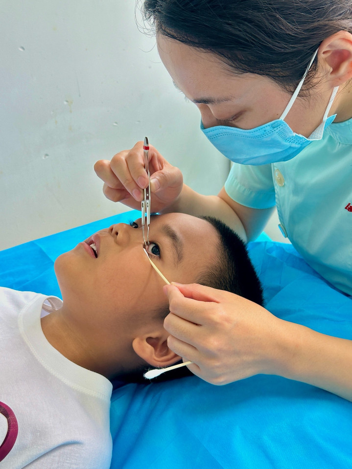 孩子哭着说嗅觉好多了,能平缓睁开眼睛了。