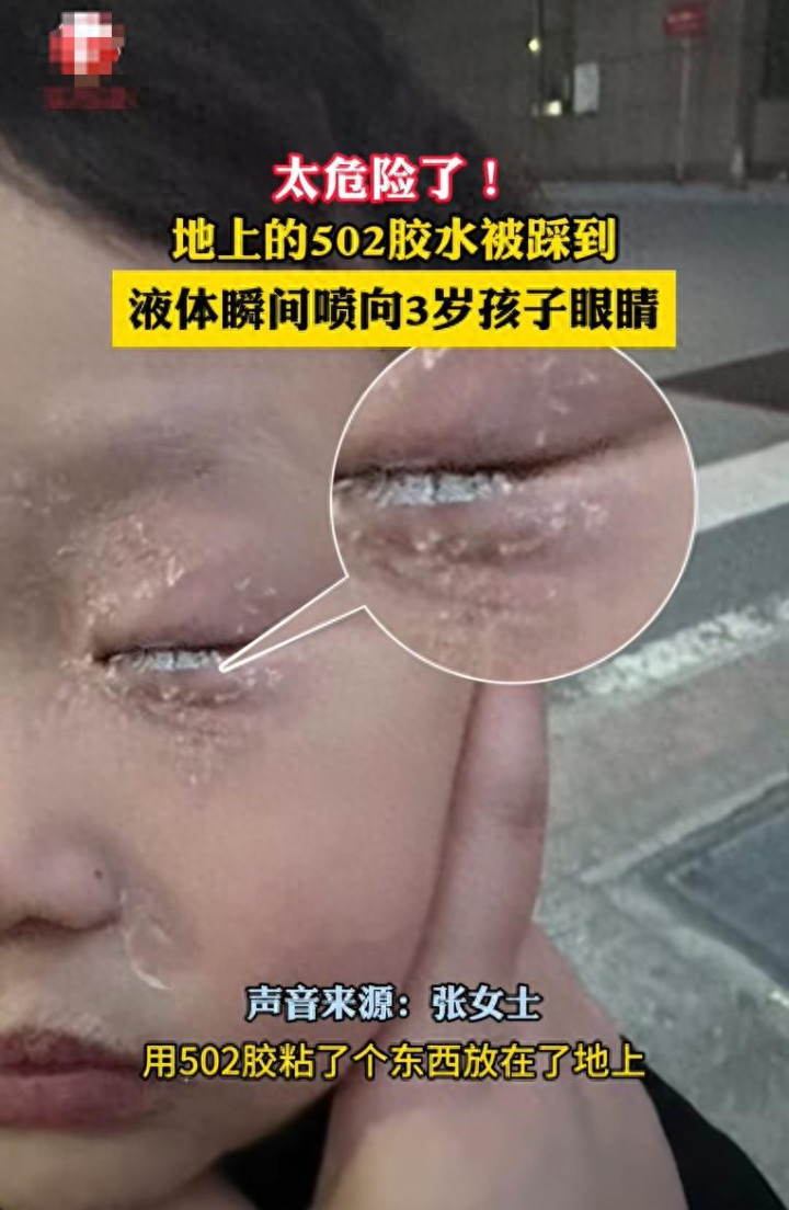 一个3岁男孩,不留神踩到地上的502胶水。胶水径直喷进眼睛,孩子疼得满地打滚。