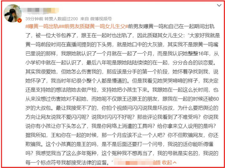 如今,这位前男友不忍了,他曝出了他和黄一鸣的真确情况,并大爆黄一鸣猛料,质疑闪闪生父的身份。