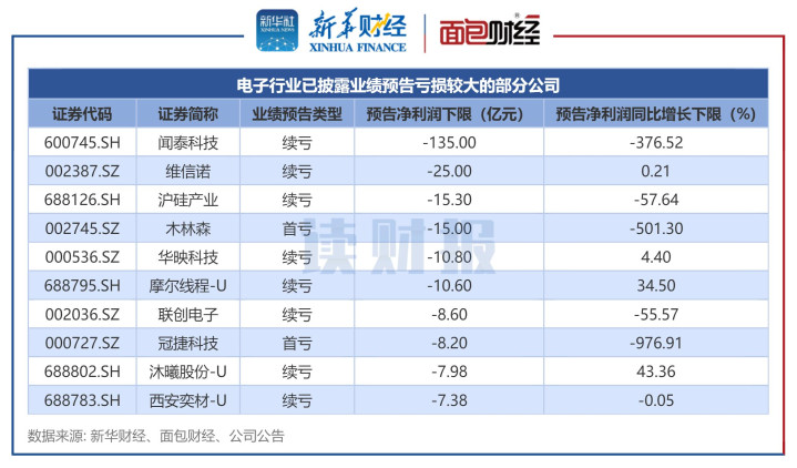 统计数据浮现,电子行业统统公布功绩预报的公司中有130家耗损。其中,预报净利润下限排行前三位的公司永别是闻泰科技、维信诺及沪硅产业。