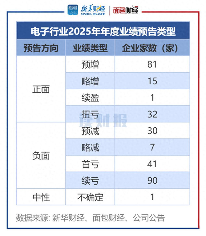 全体来看,已公布2025年年报功绩预报的298家电子上市公司中,功绩偏正面(包括预增、略增、续盈、扭亏)的企业所有为129家。