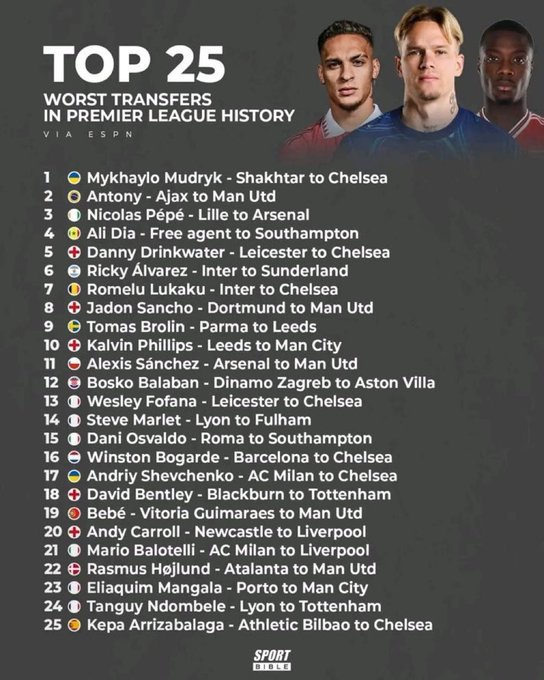 虎扑04月07日讯ESPN评比英超历史最差转会排名榜,澳洲幸运5澳门十大娱乐网站穆德里克加盟切尔西、安东尼去曼联和佩佩转会阿森纳位列前三。