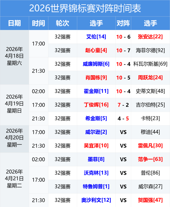 第4个比赛日将陆续有三场新比赛开战,中国选手陆续有3东谈主出战。其中包含吴宜泽与雷佩凡的内战,详备比赛时刻如下。