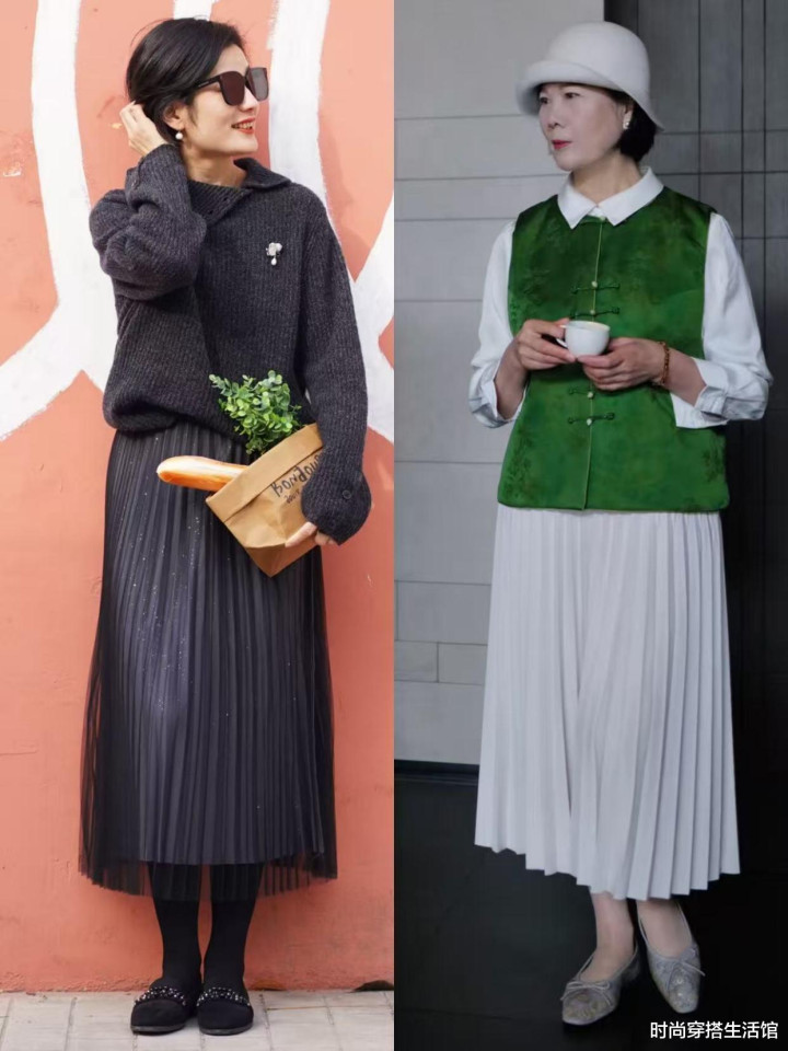 关于中年女性来说咱们还不成少了百褶裙,但这时期的咱们要选对面料和神气,这么才气更好的穿出高等感,提议全球不错挑选细巧的褶皱和有垂感的面料,比如像是真丝、缎面的百褶裙,搭配上过膝不外踝的长度,穿上后不仅有女性的柔好意思性,同期还不缺失灵动感。此外咱们不错选拔短款上衣,将衣摆塞进裙腰内部,圆善的打造出高腰线,顷刻间就不错显高显腿长。