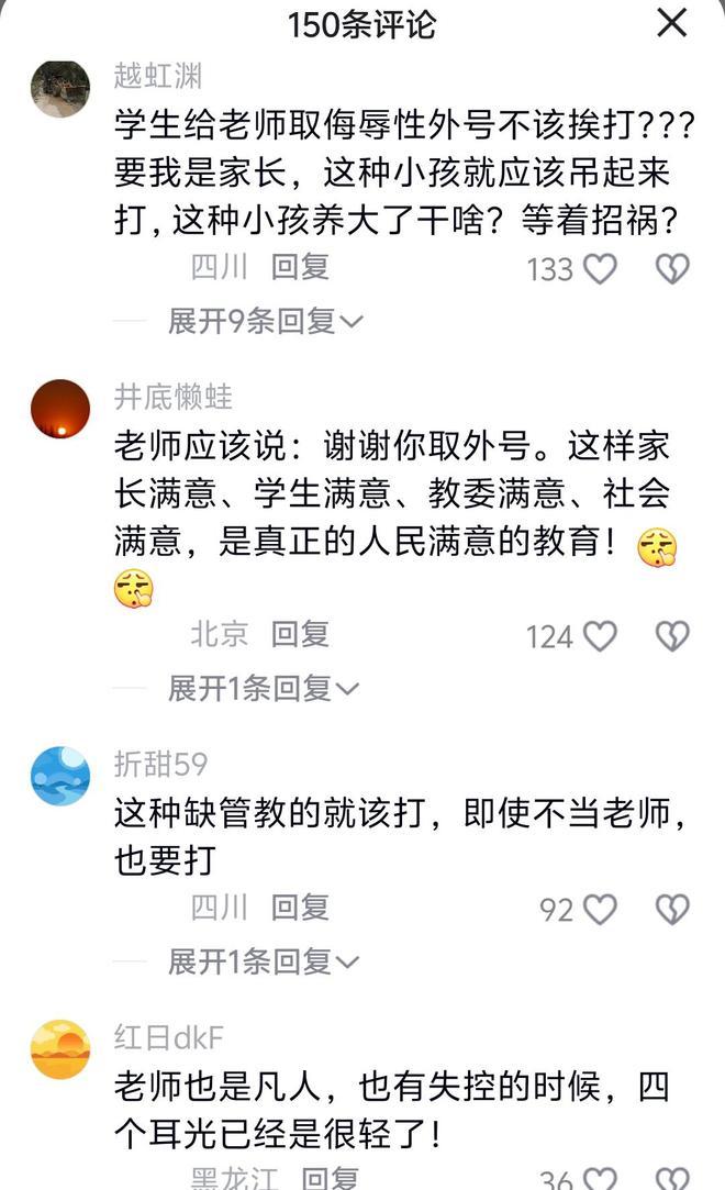 而指摘区的大量网友,当作旁不雅者,亦然众说纷纭,有东说念主站在熟识的角度,以为目前的孩子简直是太过分了,给熟识取侮辱性的绰号,难说念不该打吗?看其事发后的格调,阐发不仅该打,而且打轻了、打少了!